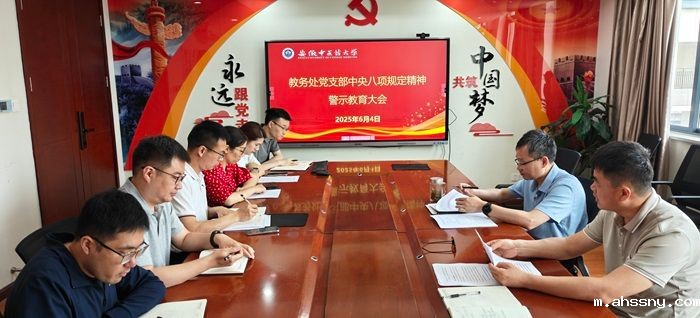 6月4日下午,教务处党支部在图书馆809会议室召开深入贯彻中央八项规定精神学习教育警示教育大会。会议由教务处党支部书记张晓军主持,支部全体党员参加,农工民主党党员、教务处处长尹刚,致公党党员黄炜列席会议。